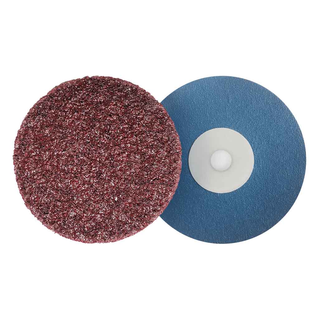 This quick change disc uses NWR non-woven material, which has a thinner scrim than the NWSB material, making it slightly less flexible and aggressive. The scratch pattern is lighter (shallow) and will leave a much better and consistent finish, especially on stainless steel and aluminum. When used properly, NWR lasts slightly longer than NWSB material. Non-woven abrasives consist of random nylon fibers bonded together into an open web, and impregnated with resin and abrasive grit. Advantages of non-woven abrasives include a consistent finish, long service life, cool cutting, and soft, yet fast working action. They are waterproof; can be used wet or dry, and easily rinsed out. Coolants, lubricants, and cleaning agents can also be used with a non-woven. With its ability to reduce loading, non-woven abrasives are excellent for paint or coating removal.